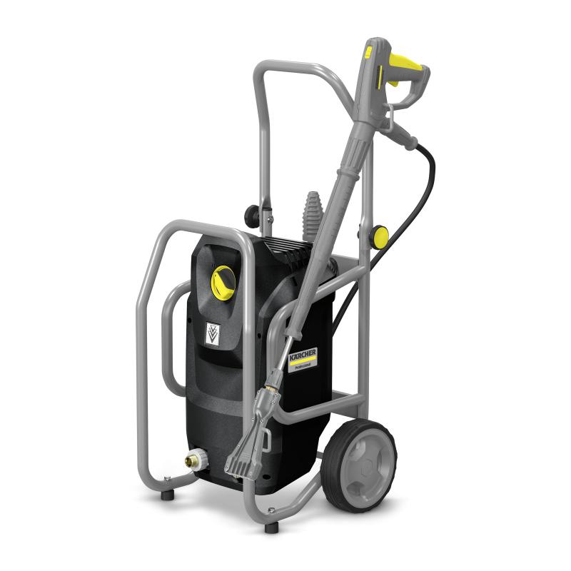 Zasnovan za vsakodnevno komercialno uporabo, zelo robusten mobilni visokotlačni čistilnik HD 6/15 M Cage s 3-batno aksialno črpalko in cevastim jeklenim okvirjem za zaščito črpalne enote.