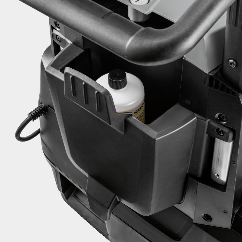 Kakovost, ergonomija in prijaznost do uporabnika: HDS 6/15 C je zmogljiv enofazni visokotlačni čistilnik s toplo vodo v kompaktnem razredu z zračno hlajenim motorjem, varčnim načinom eco!efficiency in intuitivnim upravljanjem z enim gumbom. Robustna aksialna črpalka s tremi keramičnimi bati ustvari potreben tlak. Visokotlačna pištola EASY!Force Advanced s patentirano tehnologijo šob in jekleno cevjo, dolgo več kot 1 meter, ter EASY!Lock hitrimi pritrdilnimi elementi poskrbi za ergonomsko delo. Sistem mehkega blaženja (SDS) zmanjšuje tresljaje za delo brez utrujenosti. Tehnologija vroče vode učinkovito razgradi celo maziva in zmanjša porabo detergentov, ki se natančno dozirajo iz 15,5-litrskega rezervoarja. Tlak in pretok vode je mogoče prilagoditi glede na nalogo. HDS 6/15 C, ki je enostaven za vzdrževanje, je zasnovan za vsakodnevno uporabo v težkih pogojih. Možnost odstranjevanja vodnega kamna, vodni filter in varnostni ventil ščitijo tehnologijo. Robustno podvozje ščiti pred udarci, medtem ko velika kolesa in krmilni valj/kolesce nudijo visoko okretnost. Obstaja možnost shranjevanja dodatkov.