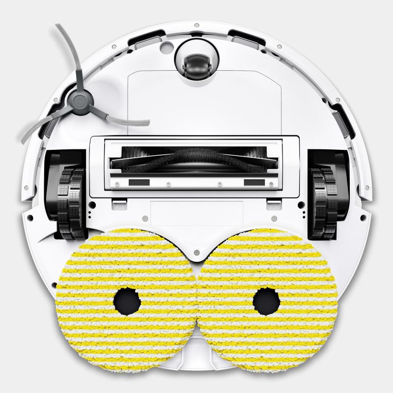 • Vrtljivi krpe za brisanje učinkovito odstranjujejo umazanijo zaradi visoke hitrosti in močnega pritiska na tla. Takoj ko robot zazna preprogo, se krpe za brisanje dvignejo, kar preprečuje, da bi se preproga zmočila. Desno krpo za brisanje je mogoče izvleči za čiščenje robov, kar zagotavlja najboljše rezultate čiščenja.