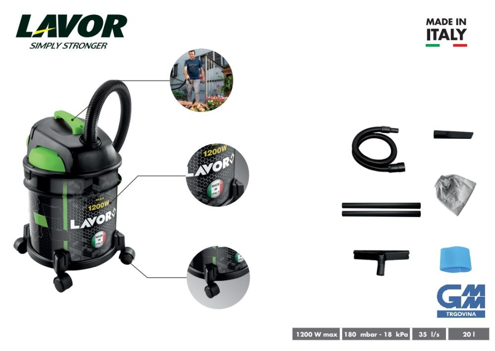 Tihi motor. Dvojna električna izolacija. Sesalni sistem z by-pass hlajenjem. Funkcija pihanja. Prostor za shranjevanje dodatne opreme. Kovinski rezervoar. Nosilec napajalnega kabla. Tehnični podatki: Napetost: 230 V- 50 Hz Prostornina rezervoarja: 20 l Sesanje zraka max.: 35 l/s Depresija max.: 180 mbar Moč: 1000 (max 1200) W max