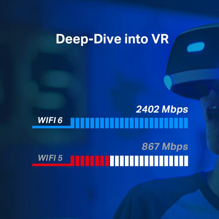 S pasovno širino 1024-QAM in 160 MHz je Wi-Fi 6 bolj zmogljiv kot navadni standardi Wi-Fi in potrebuje visoke hitrosti pri bolj zahtevnih aplikacijah, kot je npr. VR. (*1) Wi-Fi 6 ponuja 3x hitrejše hitrosti kot Wi-Fi 5. (*2)