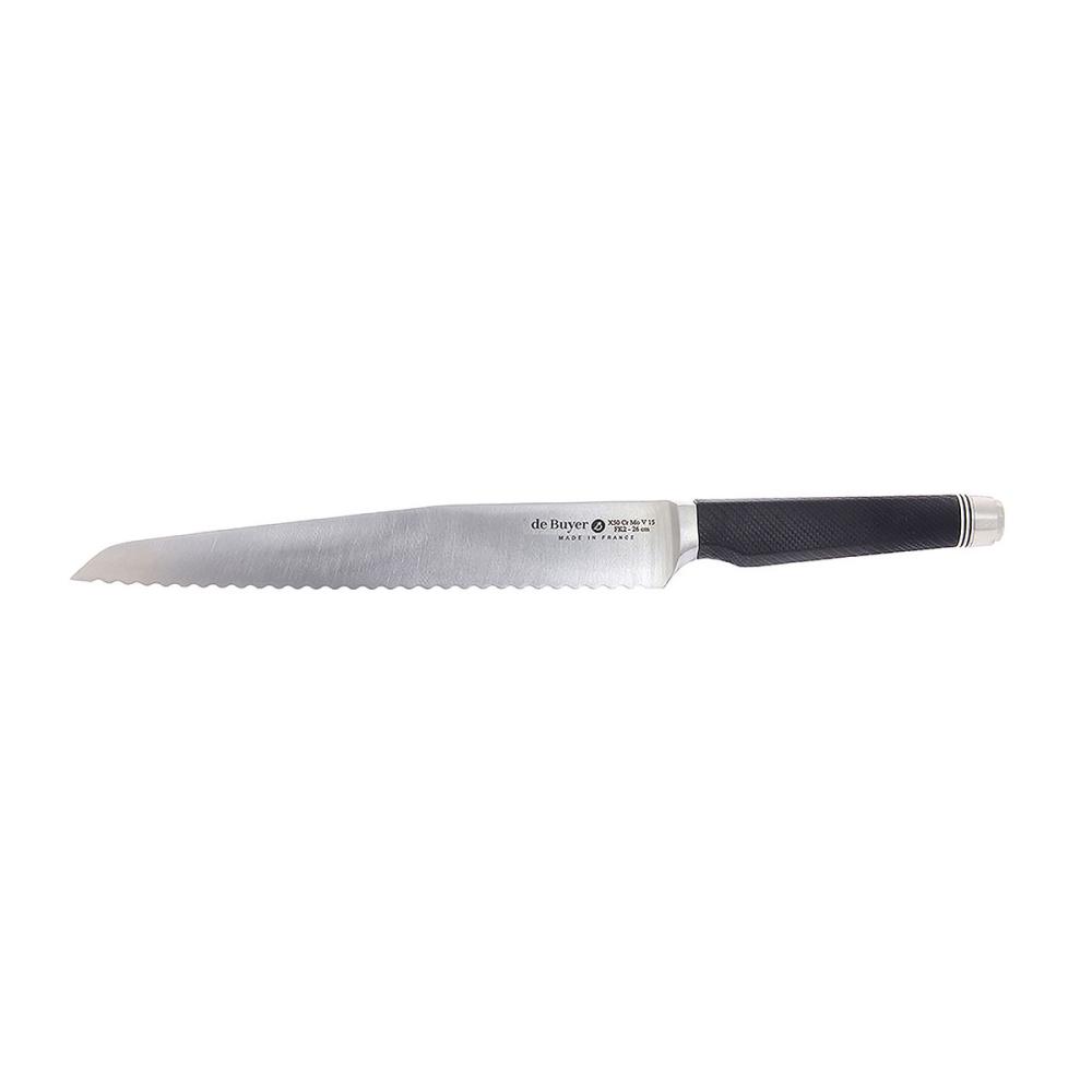 DE BUYER FK2 profesionalni nož za kruh je kot nalašč za rezanje vseh vrst kruha in nekaterih vrst tršega mesa. Nazobčani zobje na tem nožu so zasnovani tako, da omogočajo rezilu dolgo obstojnost. Rezilo je narejeno iz vrhunskega nemškega nerjavečega jekla X50CrMoV15 (1.4116), posebej poznanega po vzdržljivosti in pogosto uporabljenega ravno v proizvodnji profesionalnih kuharskih nožev. Ročaj noža je narejen iz visokotehnoloških karbonskih vlaken, ki omogočajo odličen, nedrseč oprijem.