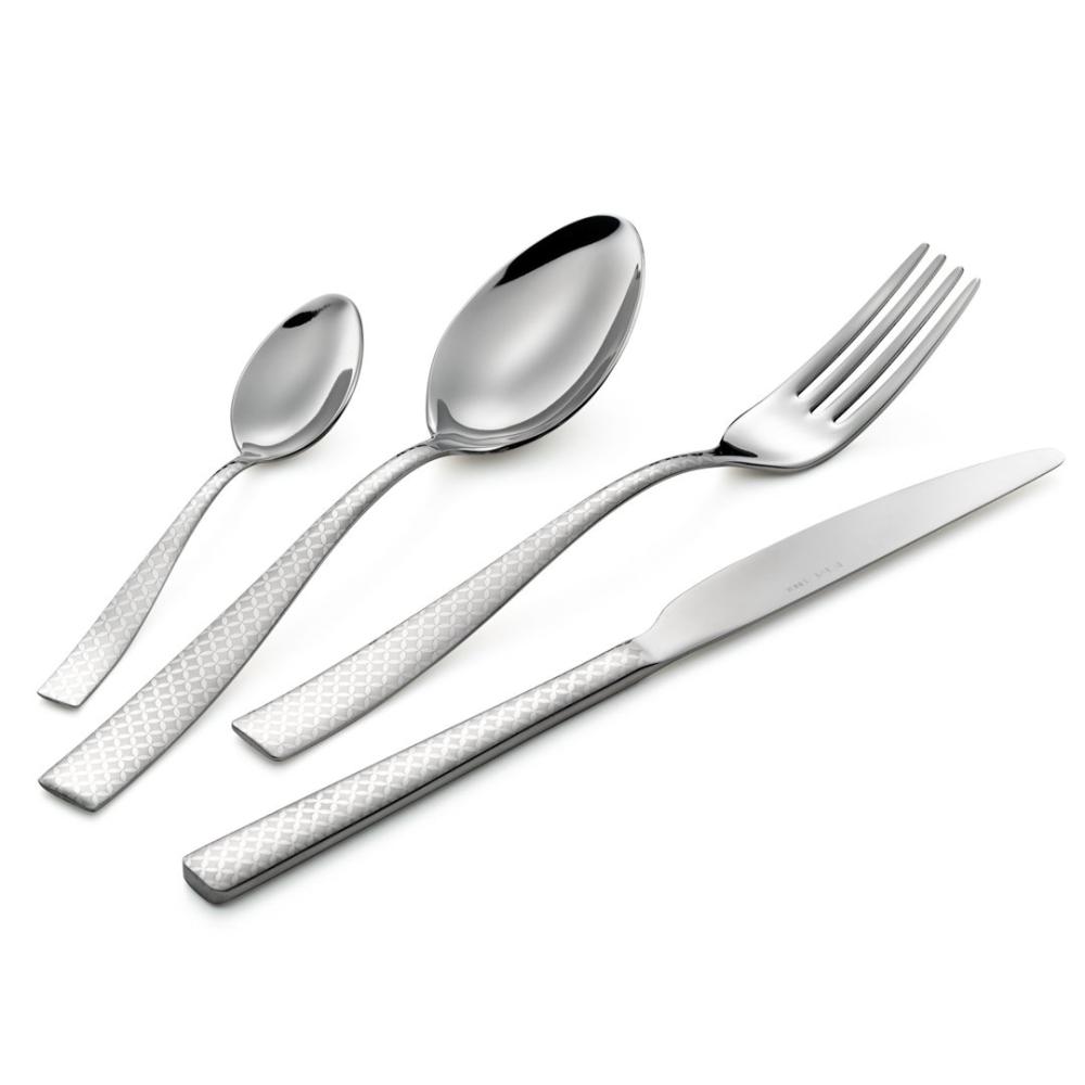 24-delna garnitura jedilnega pribora blagovne znamke EME (Made in Italy) iz poliranega nerjavečega jekla (inox 18/10) z lasersko dekoracijo je sestavljena iz: 6 jušnih žlic (214 mm), 6 vilic (214 mm), 6 nožev (242 mm) in 6 čajnih žličk (138 mm). Linija Infinity Monogram izstopa po svoji prefinjeni geometrijski zasnovi vzorca, narejenim z visokotehnološko lasersko tehniko. To je jedilni pribor z eleganco za vsakdanjo rabo. Minimalistična zasnova širokih ročajev, ki so kot vijugasti podolgovati trakovi, se zaključi v silhueto konice pribora, kar vzbuja občutek čistosti in neskončnosti.