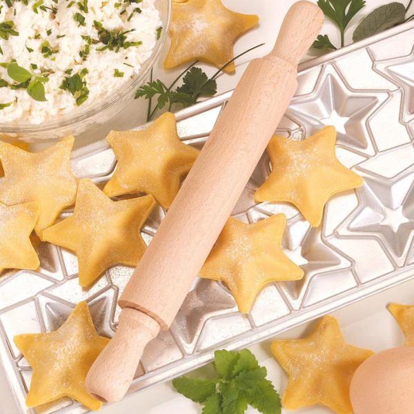 Navodila: kalup za raviole pomokajte in ga pokrijte s sveže pripravljenim listom testenin, ki ga na tanko zvaljate z valjarjem ali pa s strojčkom za testenine. Testo nežno potisnite v odprtine in jih napolnite s polnilom po vaši izbiri. Robove rahlo namažite z rumenjakom ali vodo in nanje položite drugi list testenin. S pomočjo malega priloženega valjarja iz bukovega lesa stisnite obe plasti skupaj. Z rahlim pritiskom odstranite odvečen zrak in razrežite posamezne raviole. Ko boste kalup obrnili bodo ravioli padli iz njega. Preglejte vsak raviol in se prepričajte, da je ob robovih dobro zaprt. Položite jih na pomokan krožnik.