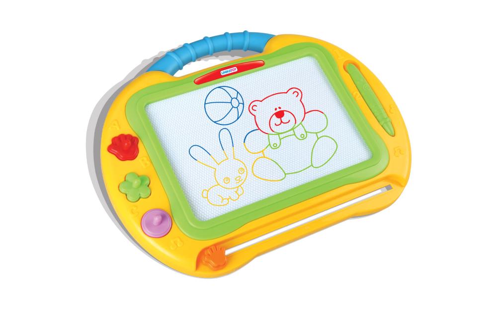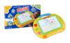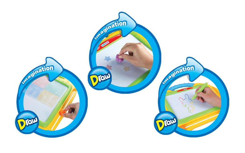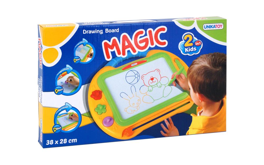 Tabla piši briši velikosti 38x28 cm ima 3 magnetne štampiljke in eno magnetno pisalo. Piši ali riši po tabli, uporabi štampiljko, ko pa se ustvarjene slikice naveličaš, povleci drsni gumb iz ene na drugo stran, da se slikica zbriše. Nato pa te pričaka belina in tvoja domišljija ima spet prosto pot.