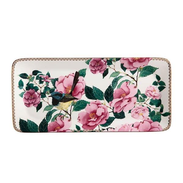 Servirni krožnik iz porcelana pravokotne oblike, dimenzij 33 x 15,5 cm, sestavlja novo zbirko čajnega servisa blagovne znamke Maxwell&Williams TEAS & C'S SILK ROAD - Svilna cesta. Kolekcijo, prirejeno po izvirnih slikah sydneyjske umetnice Gabby Malpas, navdihuje tradicionalna kitajska dekorativa, s poudarkom na cvetličnih elementih živahnih barv, motivu ptic in s čudovitimi zlatimi detajli. Glamurozno in elegantno zbirko, primerno tako za umirjeno sprostitev ob skodelici čaja kot tudi za živahnejše čajanke, sestavljajo skodelice za čaj, lončki, čajniki, »tea-for-one«, servirni krožniki in drugi izdelki iz porcelana. Izdelek je pakiran v lični darilni embalaži. Priporoča se ročno pranje izdelka.