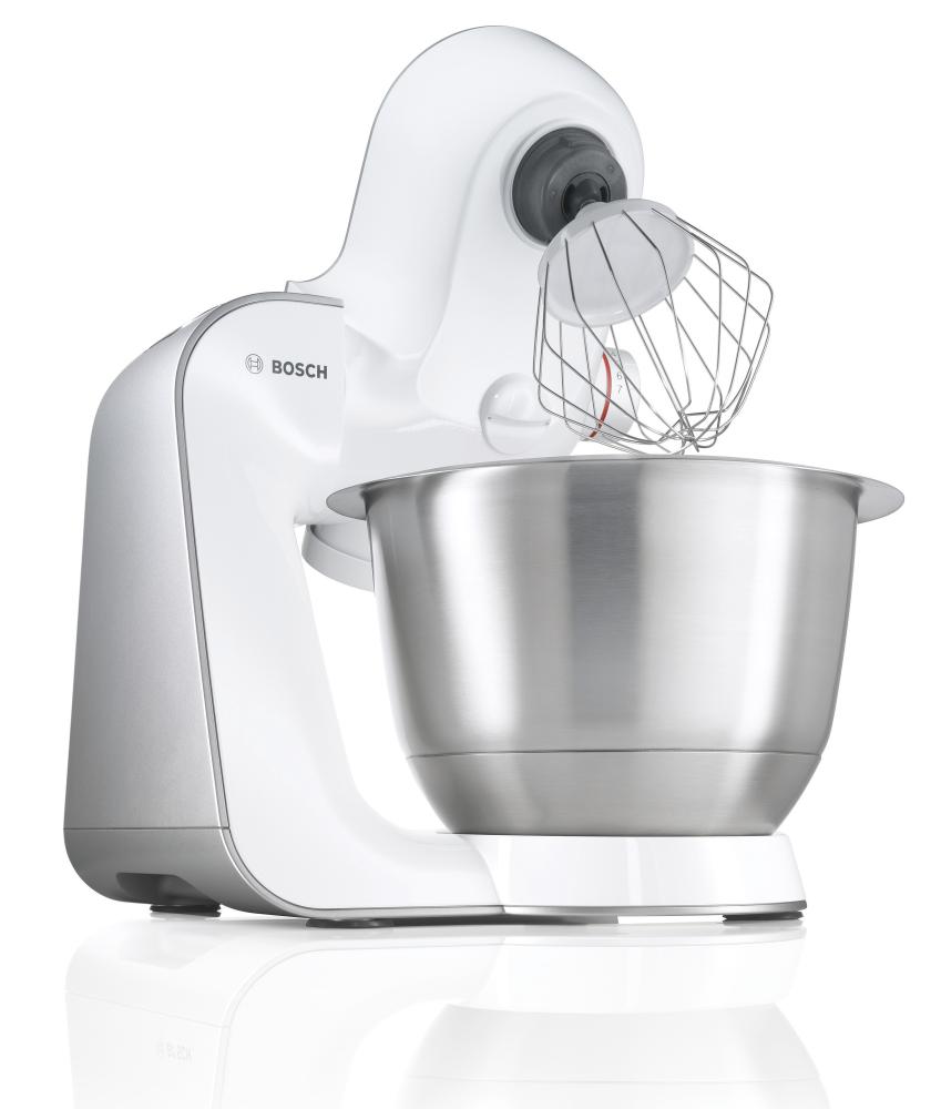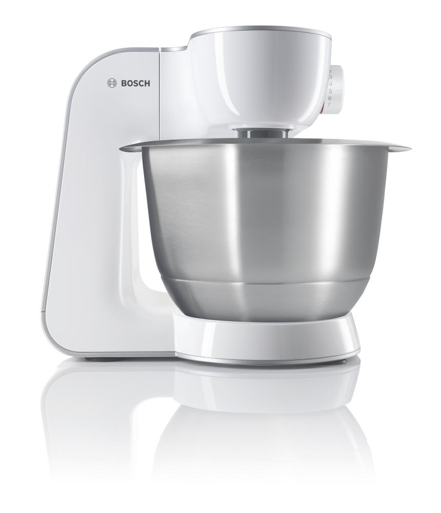 MUM5 — zmogljivi kuhinjski aparat, dobitnik nagrade za dizajn — odlikujejo ga splošna vsestranska in enostavna uporaba ter izjemna Boscheva kakovost. bela/srebrna