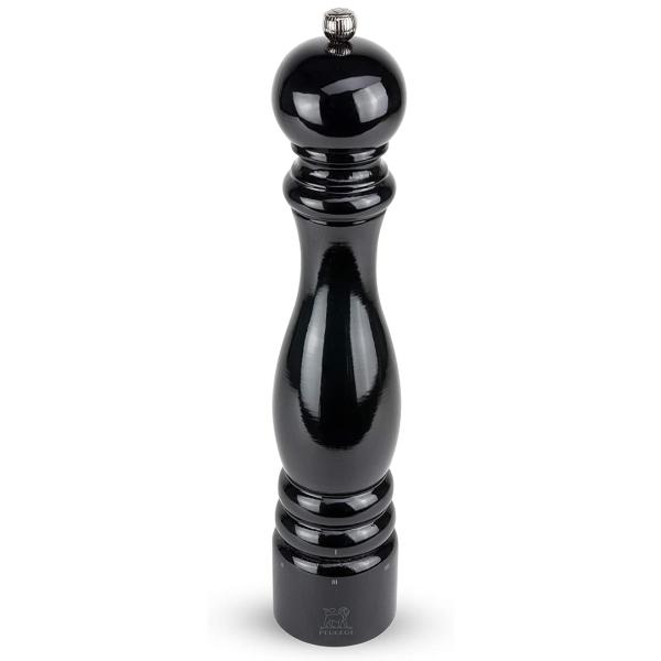 PEUGEOT ČRN MLINČEK ZA SOL PARIS je izdelan iz bukovega lesa z elegantno oblikovano silhueto, ki jo dopolnjuje srebrn gumb z vgravirano levjo glavo, ki je Peugeotov prepoznavni znak.