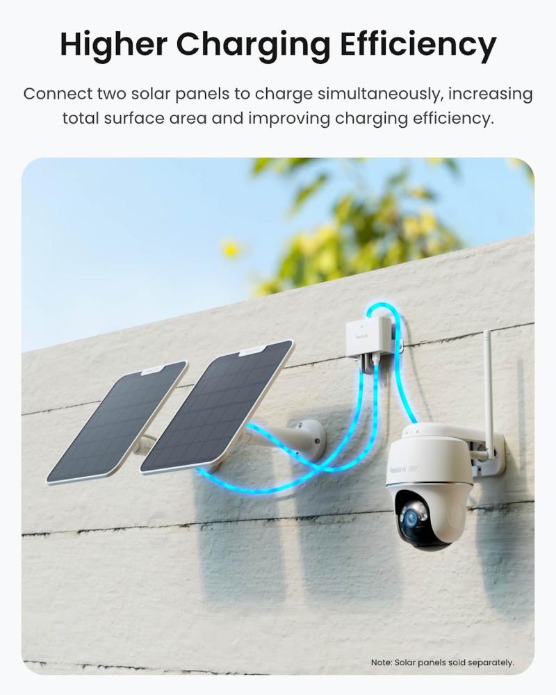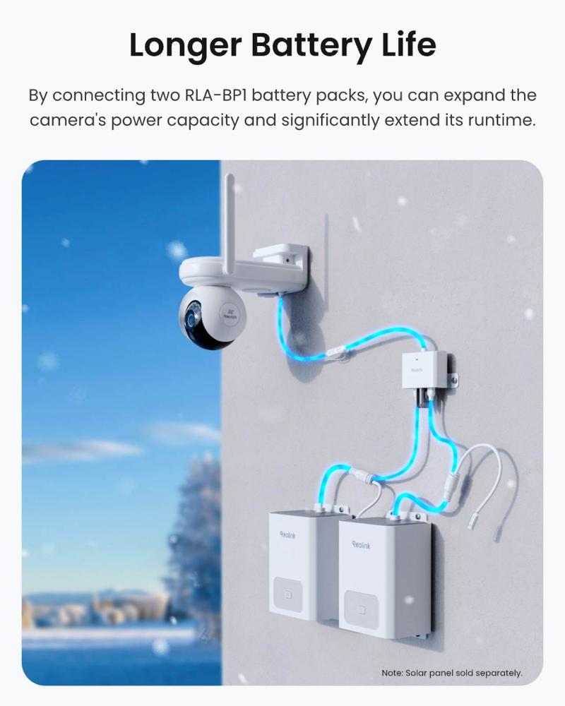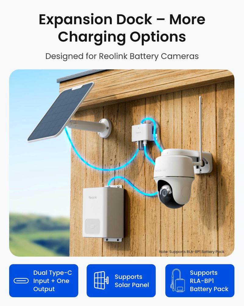 Izziv enojnega načina polnjenja je izginil. Dva vgrajena podaljška podpirata dva sončna panela ali katero koli kombinacijo sončnega panela in baterijskega sklopa RLA-BP1, kar ponuja več možnosti napajanja. Zasnovan je za skoraj vse varnostne kamere Reolink z baterijami, služi kot vozlišče za napajanje in zagotavlja ciljno usmerjeno rešitev za težave s polnjenjem. Priklopite več zunanjih baterij Reolink ali več Solarnih panelov