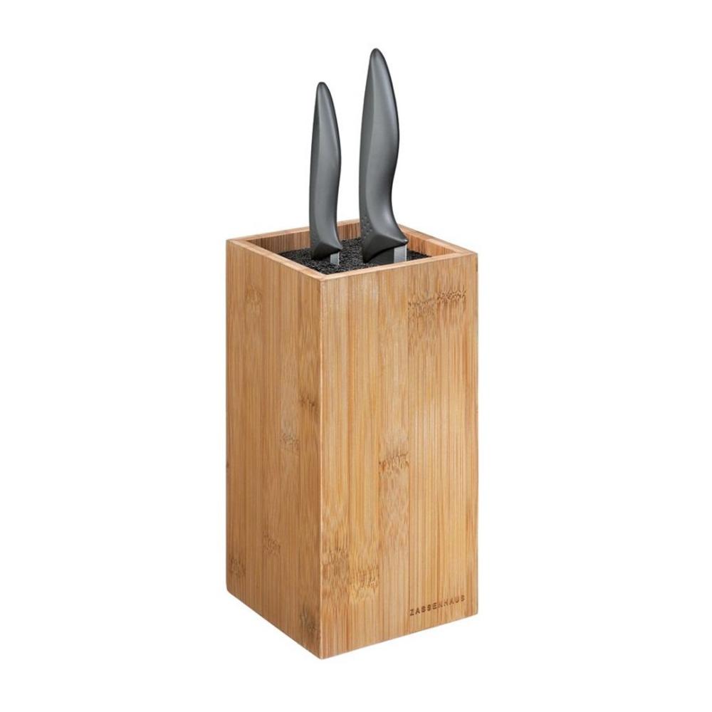 Leseno stojalo Zassenhaus za lično pospravljene nože in urejen izgled kuhinjskega pulta. V notranjosti stojala je prilagodljivi vložek iz ščetin, ki omogoča varno odlaganje vseh oblik nožev z dolžino rezila do 20 cm. Ščetinasti vložek enostavno operete ali postavite v pomivalni stroj.
